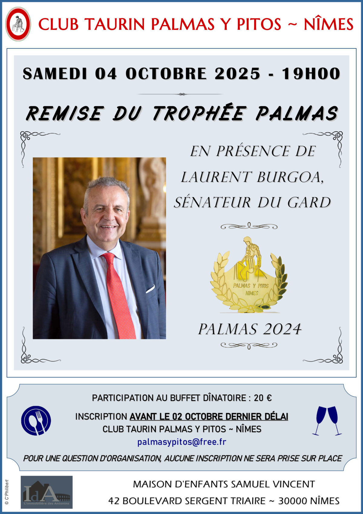 Remise du Trophée PALMAS 2024 au Sénateur du Gard, M. Laurent BURGOA, ce samedi 04 octobre à 19h00 suivie d’un buffet dînatoire convivial. INSCRIVEZ-VOUS VITE.